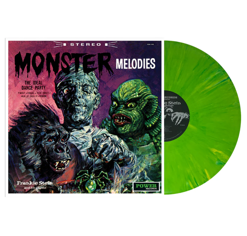 After years of visiting graveyards, combing through haunted houses, and pursuing (heh heh) dead ends, we finally tracked down the rights to the legendary Frankie Stein and His Ghouls series! Why did we risk life, limb, and livelihood to find these records? Well, first of all, we Real Goners LOVE these campy ‘60s takes on horror rock—witness our previous macabre moves into the Zacherle, Munsters and Groovie Goolies franchises. But there’s something extra special about these Frankie Stein and His Ghouls records. You wouldn’t think that Halloween records released by a subsidiary (Power Records) of a children’s specialty label (Peter Pan Records) would be so…er…visceral, but these records are definitely the most out there of their kind. And there might be a reason for that…you see, it has been revealed that the Power label enlisted the aid of some very, very interesting musicians for some of its projects. For instance, the imprint’s 1966 album Batman and Robin by The Sensational Guitars of Dan and Dale was actually produced by Tom Wilson of Bob Dylan, Velvet Underground, and Mothers of Invention fame—and the band was made up free jazz legend Sun Ra and members of The Blues Project! Which has led to all sorts of speculation about who Frankie Stein and His Ghouls actually were; among the names bandied about are guitarist Duane Eddy, jazz saxophonist Max Greger, and, yes, Sun Ra and the Blues Project again. At any rate, prepare yourself for frenetic rock-and-twist workouts punctuated by deranged howls and shattering sound effects. And with a back story like this, it’s no wonder original copies of these albums sell for downright horrifying prices. Sporting an all-star crew of movie monsters on the front cover, this 1965 slab from the vinyl vault features perhaps our favorite song title from the entire Frankie Stein series: “Ain’t Got No Body.” Though “Ghoulish Heart” is not far behind! Never reissued in any format, here in radioactive green vinyl limited to 900 copies!